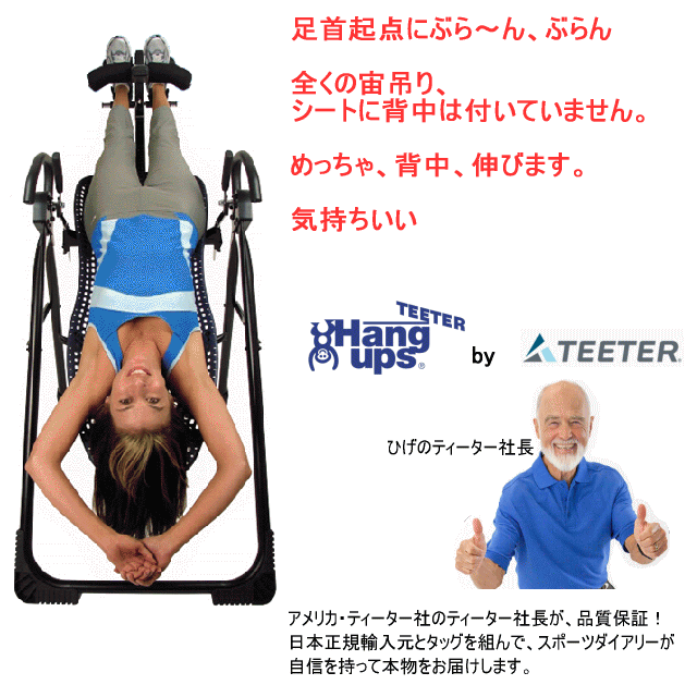 お支払い方法で商品代引を選択されると、他のお支払方法に変更していただく手続きなどでお届けが遅くなる場合がございますのでご注意ください発送予定在庫切れ商品を除き、ご注文確認後、1〜2営業日程度で発送できる見込みですTeeter Hang Ups チーターハングアップス 逆さぶら下がり健康器 EP-550腰痛や背中の痛みの原因に注目した「世界で最も売れている逆さぶら下がり健康器」一日たった数分、本器具にぶら下がれば、腰・背中だけでなく内側の背骨までが優しくストレッチされます。